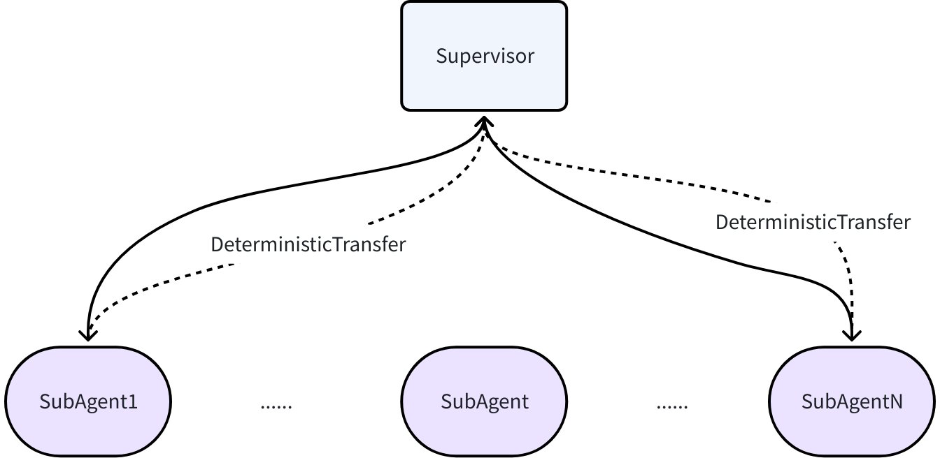 In Supervisor mode, after a SubAgent finishes execution, it always returns to the Supervisor, which generates the next task objective. AgentWithDeterministicTransferTo can be used here:
