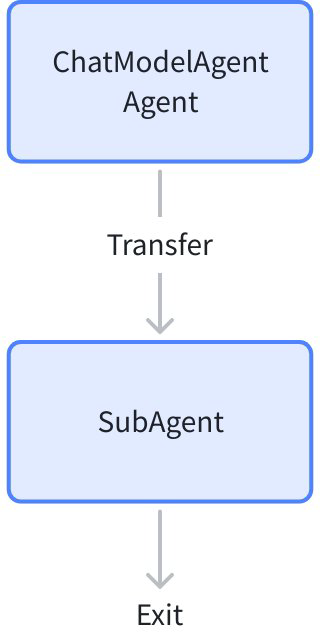 Transfer corresponds to the [Transfer collaboration method]. When an Agent produces an AgentEvent containing TransferAction during runtime, Eino ADK calls the Agent specified by the Action. The called Agent is called a SubAgent.