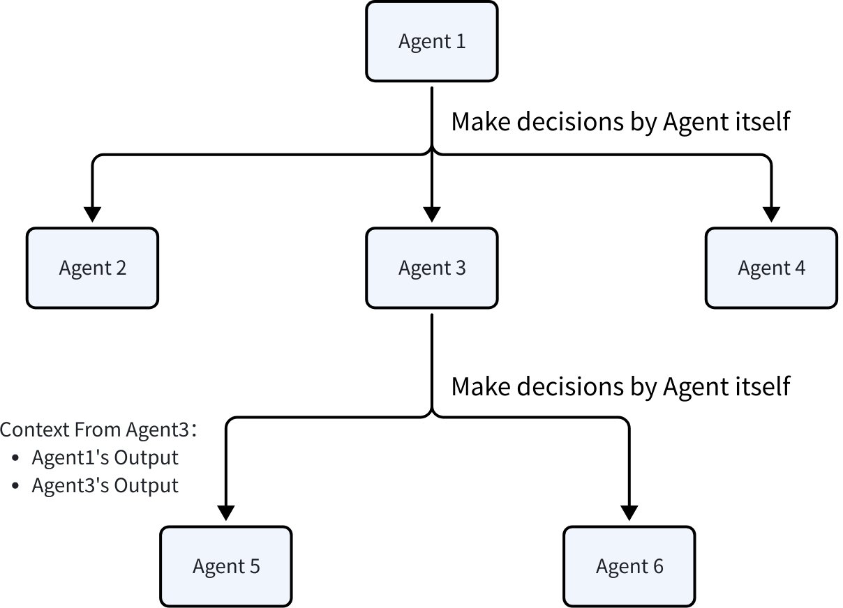 Autonomous DecisionWithin the Agent, based on its available downstream Agents, when assistance is needed, it autonomously selects a downstream Agent for assistance. Generally, the Agent makes decisions based on LLM internally, but even if selection is based on preset logic, it is still considered autonomous decision from the Agent's external perspective