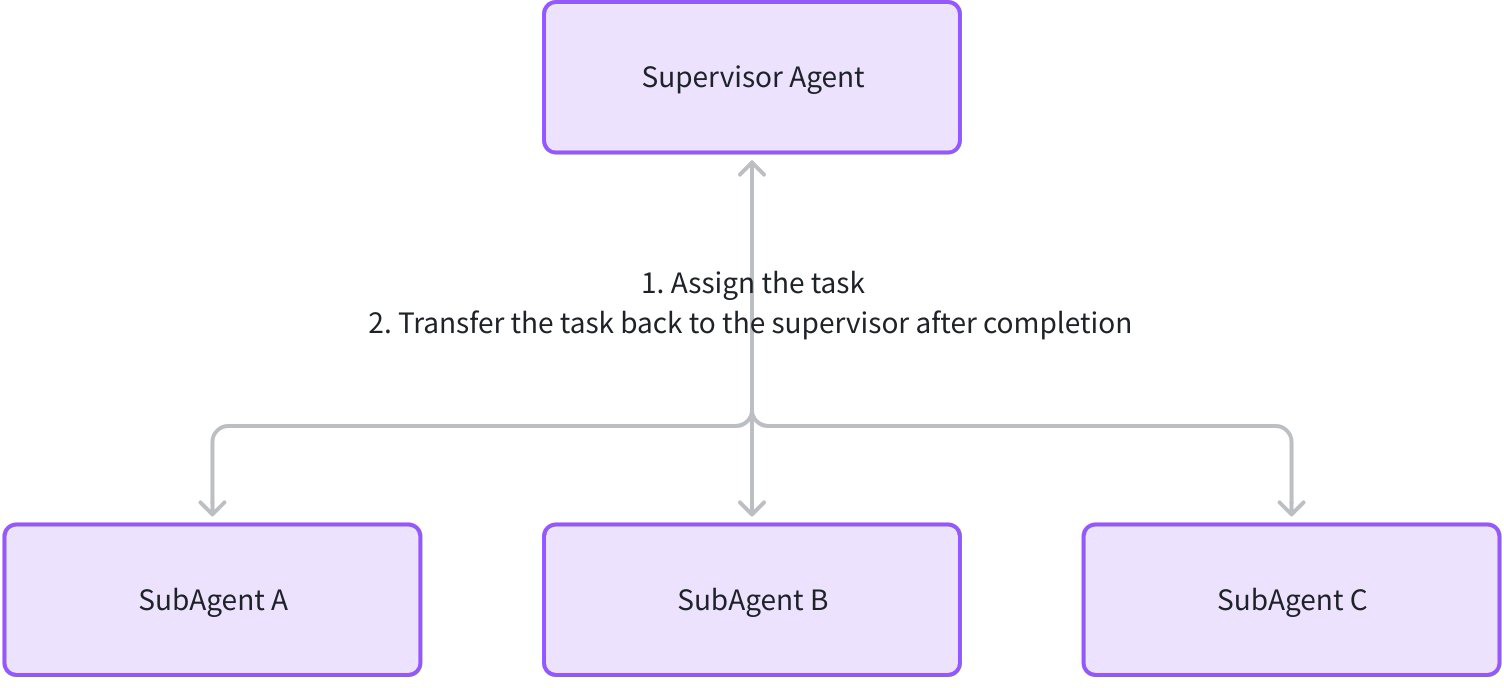 2. Centralized Control: Supervisor uniformly manages sub-agents, can dynamically adjust task allocation based on sub-agent execution results (such as assigning to other sub-agents or directly generating final results).