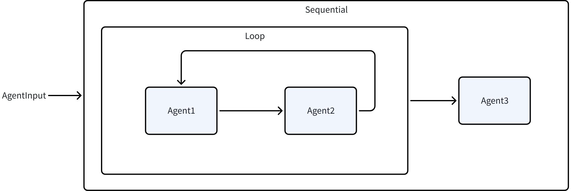 • LoopAgent: Loops through a sequence of sub-agents