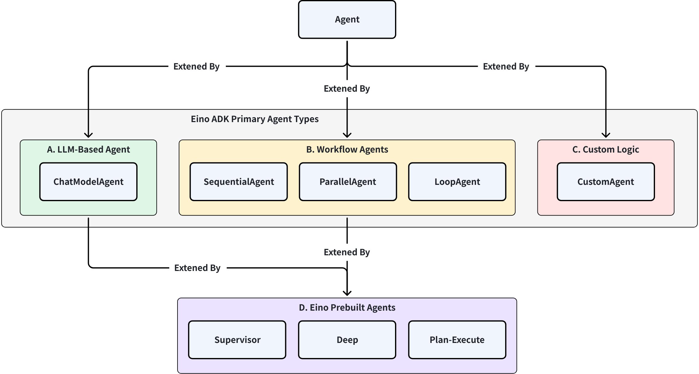 | Category | ChatModel Agent | Workflow Agents | Custom Logic | EinoBuiltInAgent (supervisor, plan‑execute) |