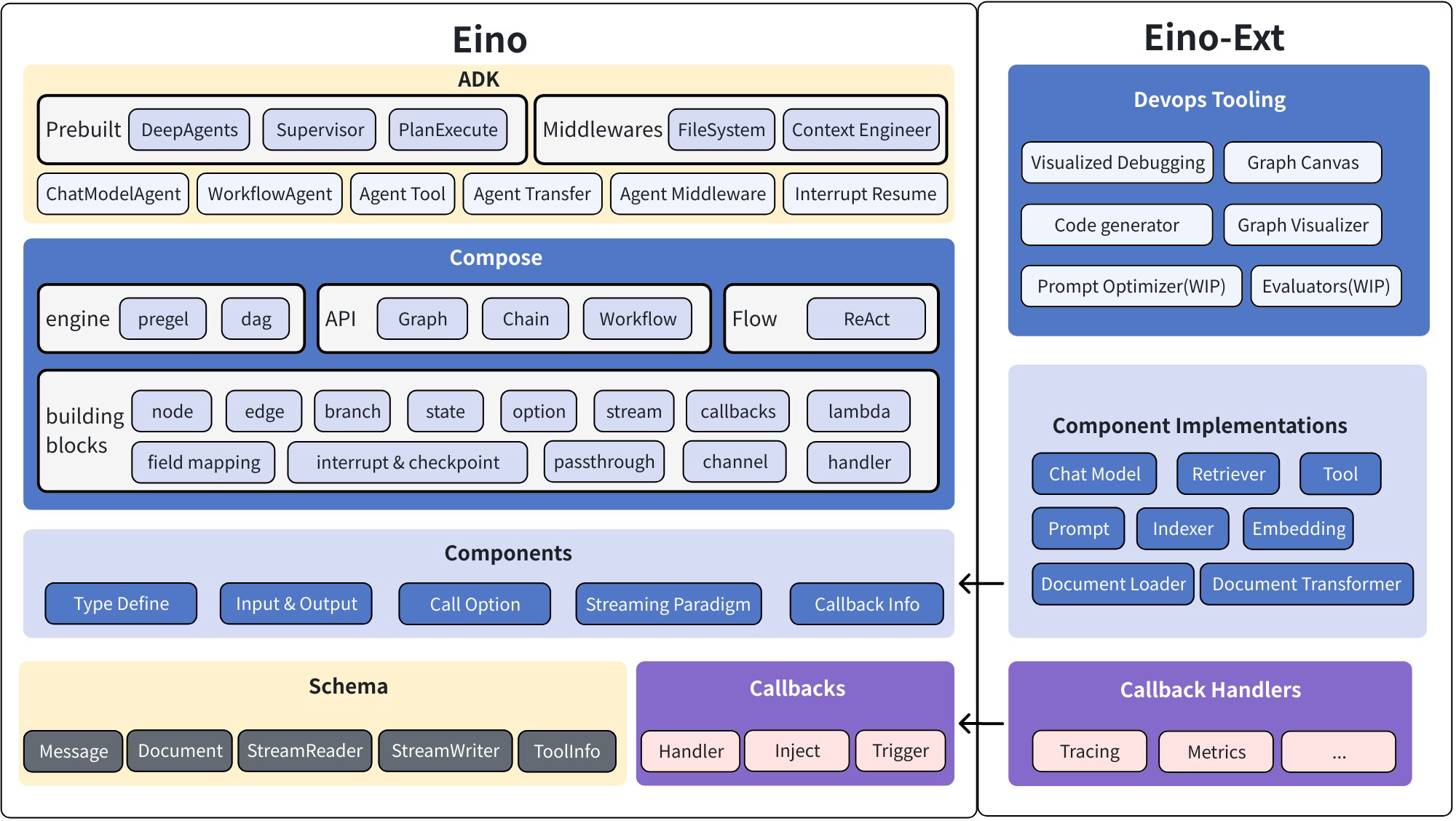 Eino: Contains type definitions, stream data processing mechanisms, component abstraction definitions, orchestration functionality, callback mechanisms, etc.